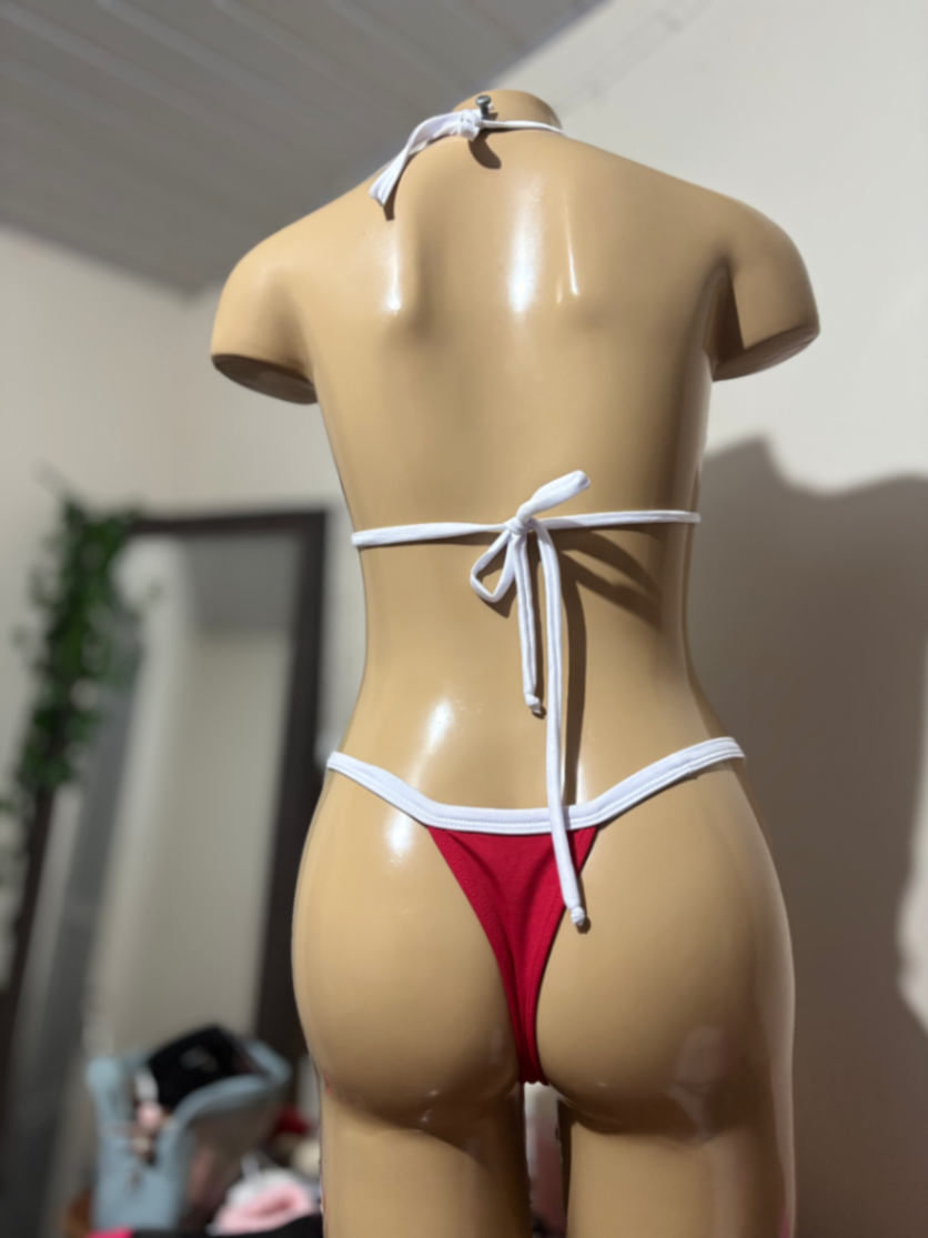 Biquíni triângulo vermelho com detalhes brancos, caimento moderno e acabamento de alto padrão. Tecido com elastano oferece elasticidade, conforto e ajuste seguro o dia inteiro. Alças ajustáveis e calcinha de tiras proporcionam modelagem suave que valoriza as curvas. Ideal para praia, piscina e viagens, com secagem rápida e resistência ao cloro. Conjunto versátil para quem busca estilo e qualidade.