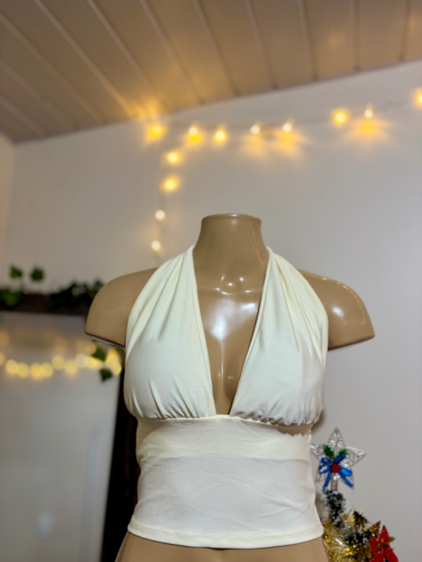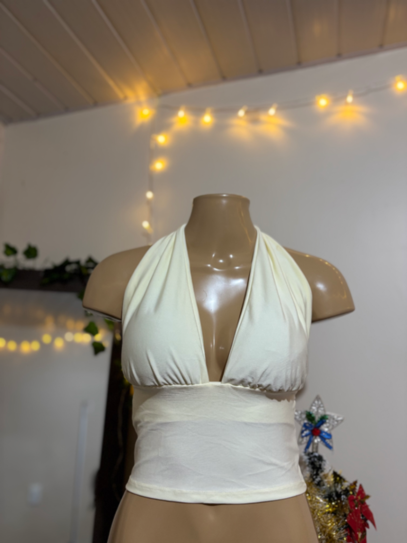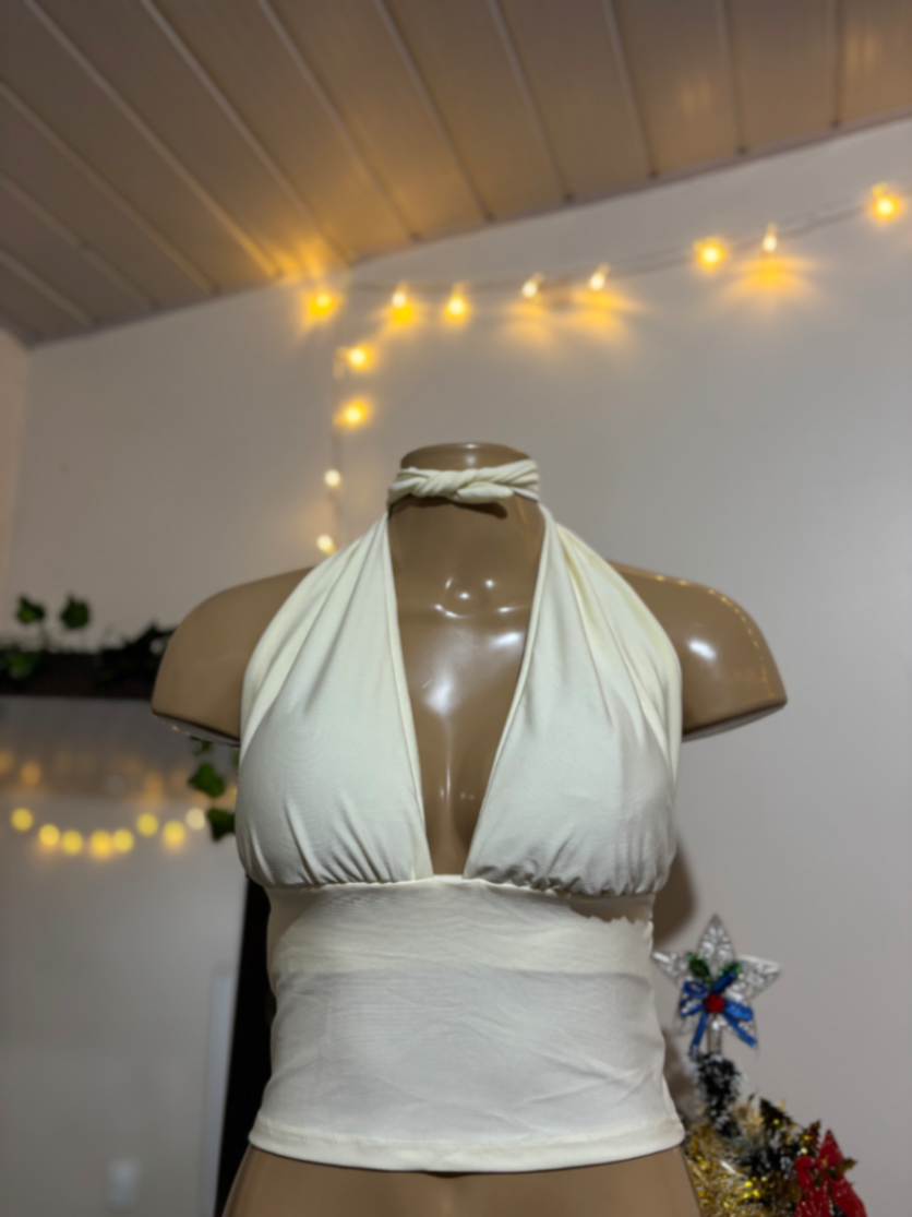 Top halter cropped branco, tecido macio e elástico que veste com conforto o dia todo. O recorte em V cria um decote elegante, enquanto a faixa na cintura define a silhueta sem marcar demais. Versátil para looks de praia, piscina ou passeio, combina com shorts, saias ou calças de cintura alta. Leve, fácil de cuidar e ideal para compor produções modernas.