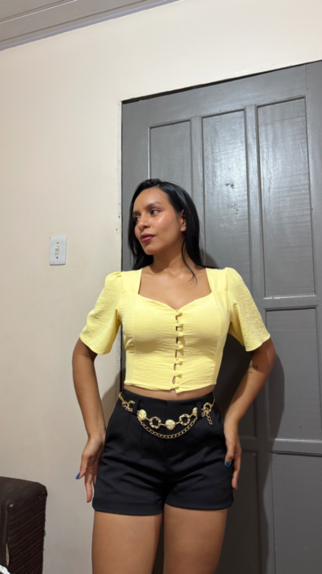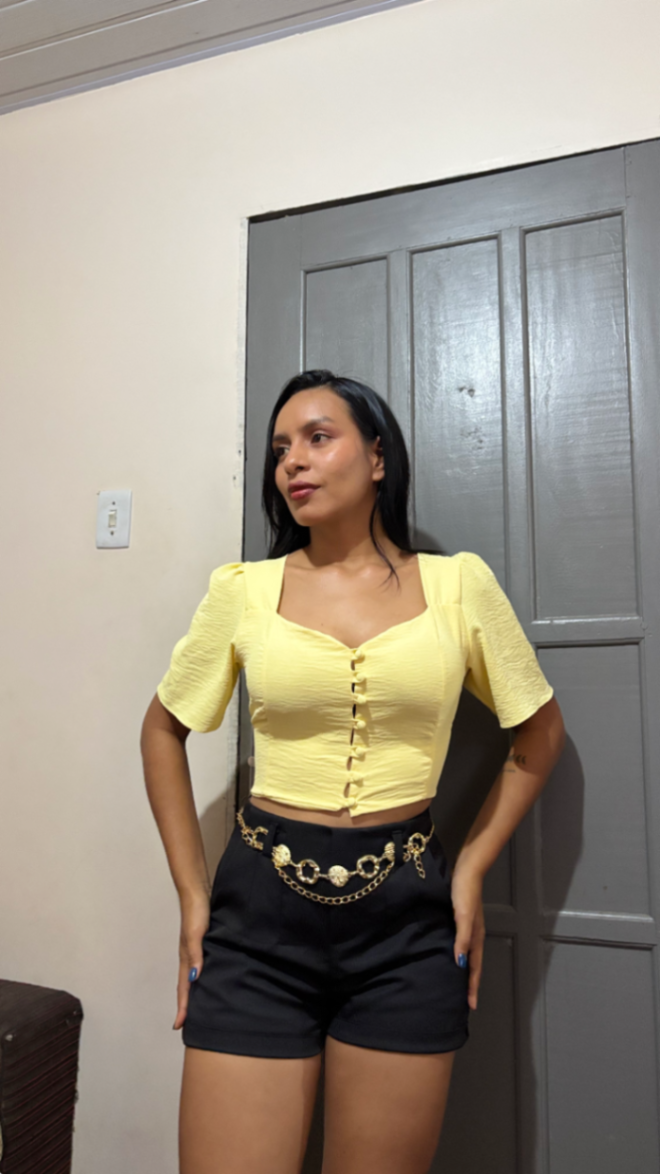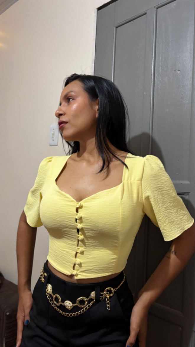 Blusa cropped amarela com mangas bufantes e decote quadrado. Confeccionada em tecido texturizado leve, oferece caimento elegante e conforto o dia todo. Fechamento frontal com laços decorativos cria um acabamento moderno e feminino. Combine com jeans ou saia de cintura alta para looks casuais ou ocasiões especiais. Perfeita para quem busca estilo sem esforço.