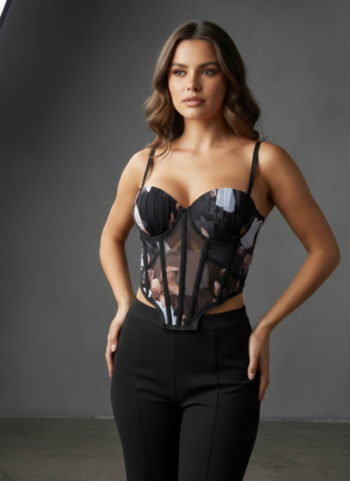 Corpete corset floral preto, com tule translúcido e recortes estruturados. Modela a cintura com barbatanas internas, oferecendo caimento firme e elegante. Alças ajustáveis e fechamento por ganchos garantem ajuste perfeito e conforto o dia todo. Perfeito para looks de festa, noite ou composições com saias e calças. Destaque para estilo sensual sem perder sofisticação.